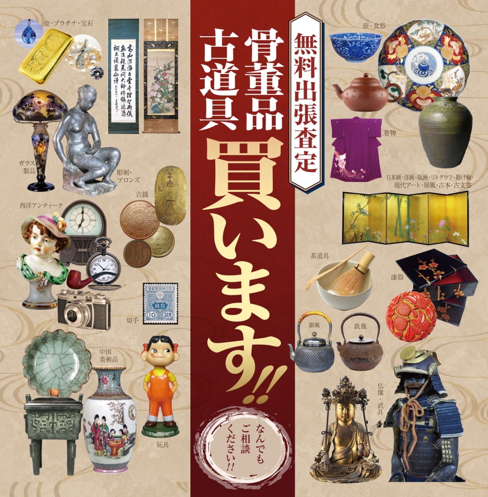 確かな信頼と実績でお客様の大切なお品の無料査定から買取まで承ります。また、ご家族の倉庫や蔵で長年放置されたもの、大口の品物についても安心してご相談ください。