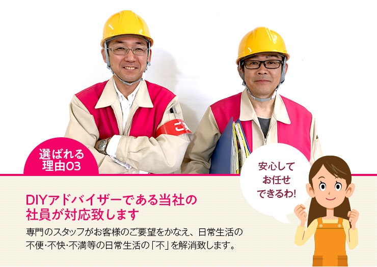 「電球、錠前交換」「家具組み立て、移動」から「お庭のお手入れ」まで豊富なメニューをご用意!年間300件の実績。中四国で11店舗のホームセンター西村ジョイが運営するキューピッドのDIYアドバイザーが、圧倒的な信頼を持って、今後の快適な生活をお届けします。